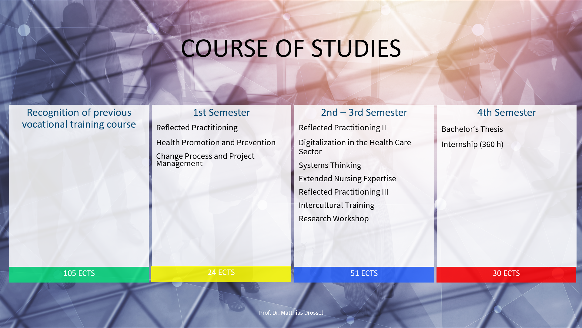 By successfully completing the part-time degree program “Nursing (B.Sc.)”, you will earn the qualification of Registered Nurse (B.Sc.) with an academic degree. This qualification enables you to approach everyday challenges in healthcare analytically and reflectively, and to handle complex nursing tasks and processes even more effectively by incorporating the latest research findings.